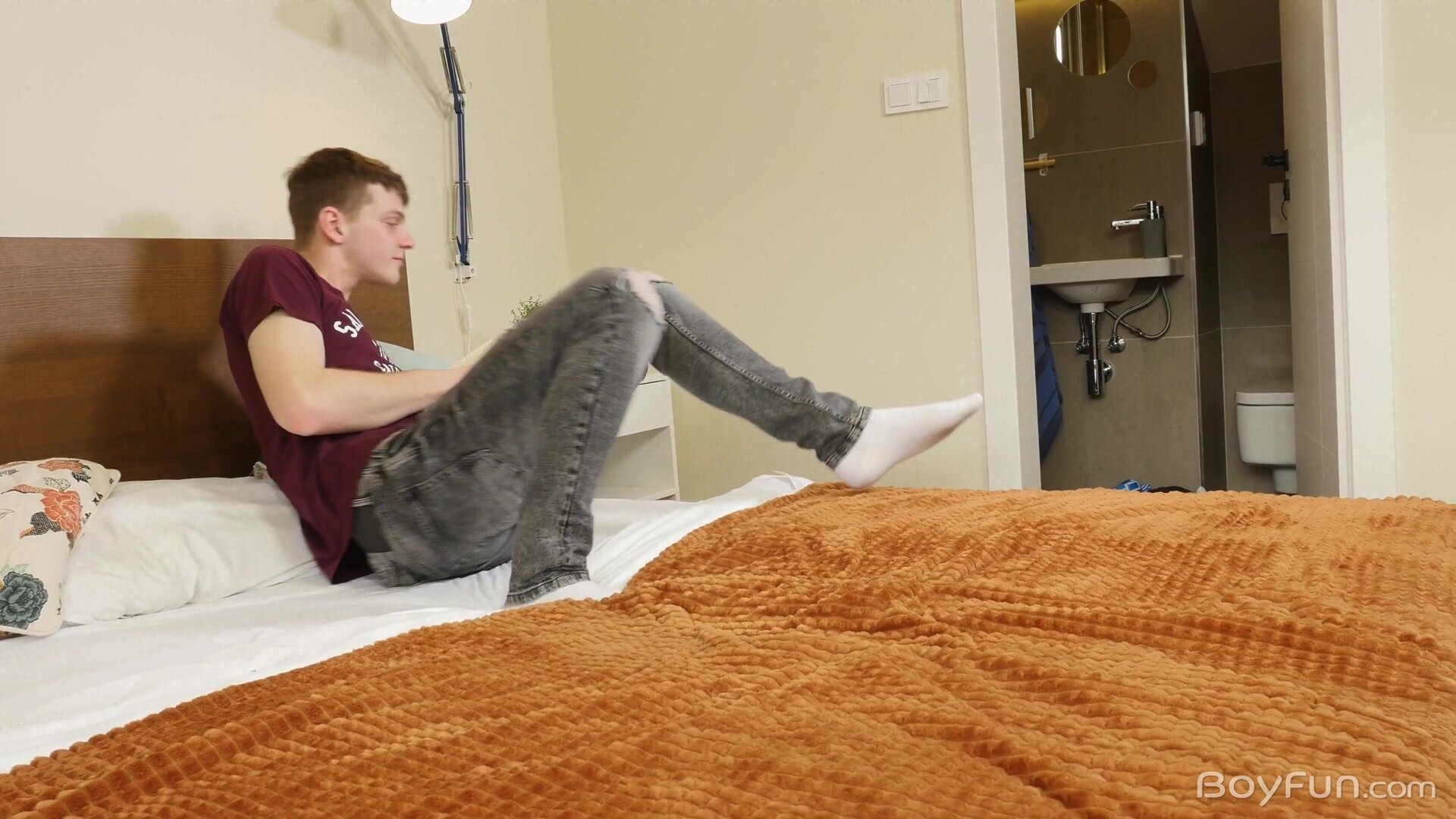 Cute boy Darren is enjoying a good book in the bedroom when fit young Beno arrives to make use of the shower. Of course this horny young guy isn't shy in the least, he makes sure to leave the door open so his curious friend can spy and watch him pleasuring his big stiff penis while he cleans up.