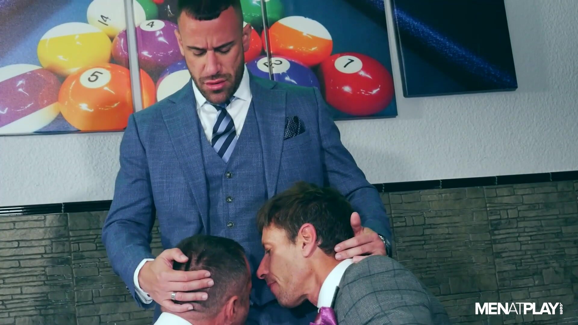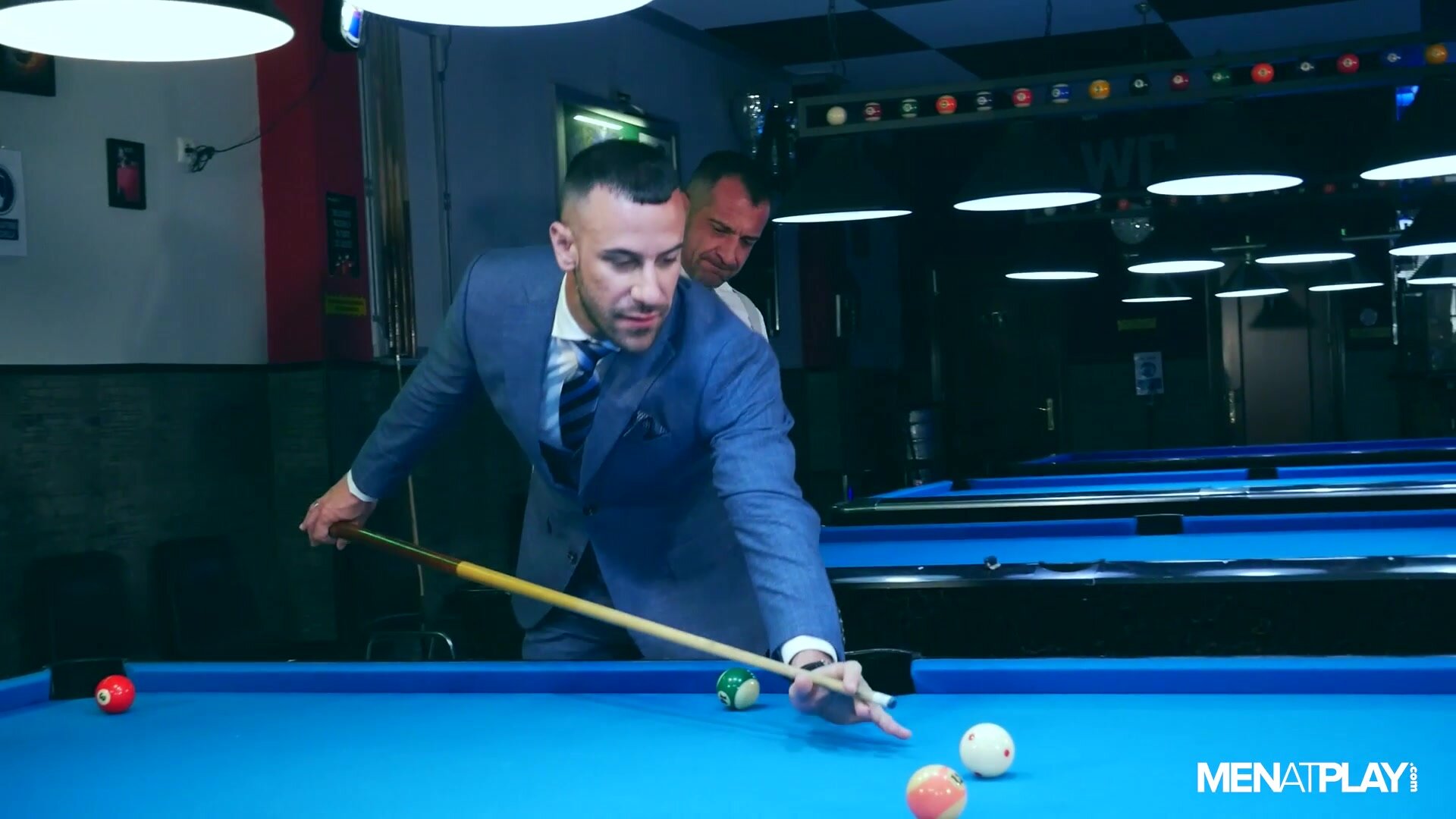 Description: (Models David Linset, Gustavo Cruz, Steve Jouret). Why play a game of billiards with only one cue stick and one cue ball when you can play with three of each? Business associates David Linset and Steve Jouret are playing a game when Gustavo Cruz asks to join them. While they play, the three men give each other seductive looks - staring at each other’s movements around the table. They hit the cue ball with strong and fast skill with their long and firm sticks. Soon their clothes become a handicap to their game, so they gladly take them off and enjoy playing a different game; including a lucky Pierre!