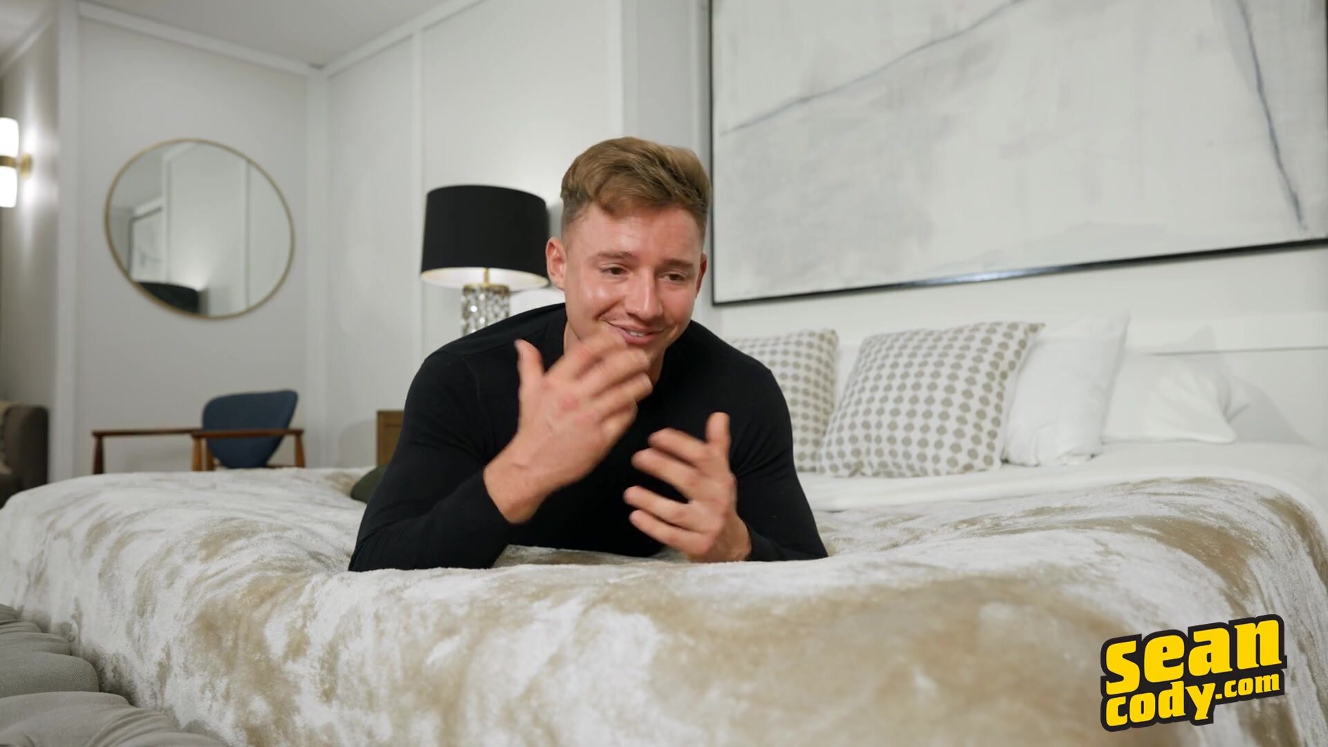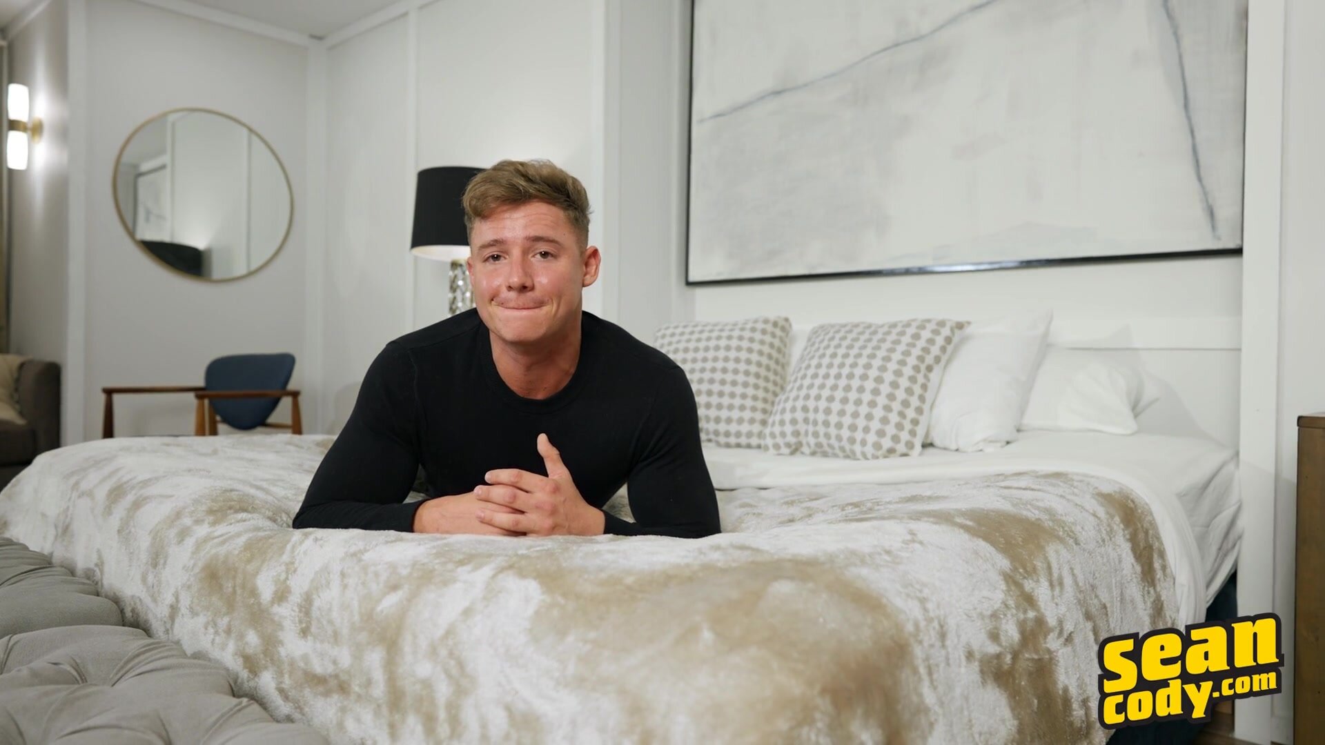 It's taken over a year, but cute blond Max has finally made it to the Sean Cody studio to film his first solo. Max says he was looking for some excitement to add to his usual routine of working out five days a week and wheeling and dealing in real estate, and he's come to the right place! The interview quickly gets personal, and Max divulges, "I don't know, I've been told I have a pretty good dick. Uncut, and then meaty. It gets compliments." He's sensual but also enjoys pushing boundaries, and is all about making sure his partner has a good time. Max gets started by stroking and teasing his muscular chest, pushing up his tight white t-shirt before stripping it off and playing with his nipples. Max takes off his jeans and rubs his uncut cock through his briefs, finally tugging it out and stroking it. This hunk gives you a great view of his ass as he gets on all fours, then kneels and jacks his cock till he cums, and he's got more in store for you.