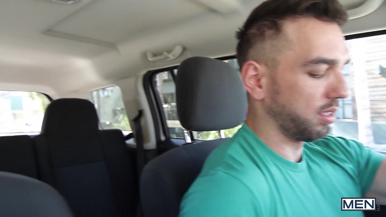 After reaching for Topher's crotch, Lucky moves to the backseat where he strokes and sucks his big dick.