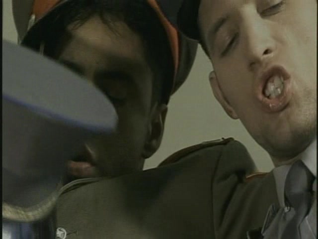 As the officers gather together for an orientation, a call comes in that there is a bomb in the office! 30 minutes and it will go off. They fan out to find the bomb, with time ticking. None look at all frightened, wearing their sullen faces as befits the characters. Jiri Honza, a handsome lighter guy with chiseled cheeks, isn't too excited to even look for the bomb with partner Jarda Tiborko, a darker man with bushy eyebrows and blond-tinted hair, because he claims that even if they find the bomb, it's not like they can defuse it. I'm glad this isn't my local police force. What they do find, however, is a secret stash of dildos. "See, unlike the bomb, we can do something with this," it's noted. "At least we'd die happy," Jiri says. Can't really argue with that, huh? So, out come their natural dicks (to the accompaniment of the soundtrack's fun martial march music). They kiss and rub together with neat intensity and Jiri blows. Again, they are fully clothed, so the movements in boots, uniforms and hats make it a bit clunky. Jarda sucks as well, doing better with Jiri face-fucking him very quickly. Now naked, Jiri works the dildo into Jarda's ass, slipping it in just to the head to open up his pal. They reverse roles so inked Jarda can ram the piece up Jiri's pretty ass. It fits much better in this fuzzy butt. Fellow officer Julien Veneziano comes to tell them the search is off because the bomb scare was a false alarm, but he skips that part and goes right to the undressing. The two blond studs double team his cock, finally working their mouths and sharing with lovely selflessness. Julien returns them to anal duty by fucking Jiri with his hefty thick cock. This fits best of all and he's able to ram most of it into Jiri's tight ass. He doesn't forget Jarda, who is on the receiving end of a doggy-fuck from Julien that matches his beaut of a cock with Jarda's luscious muscular ass. Lastly, Julien stands between the guys, sucking them off so that everyone can get off a good cum blast.