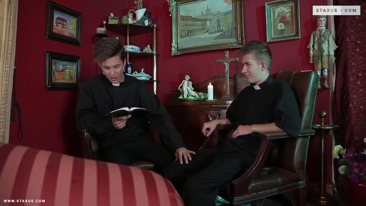 Angelic Lopez Devilishly Creams His Buddy’s Arse Mid-Fuck! - Angel Lopez, Johnathan Strake 2016 To any outside observer it seems that young priests, Angel Lopez and Johnathan Strake, are as devout as it’s possible to be – reading scripture and praying on a daily basis. Take a closer look, however, and you realise that the temptations of the flesh are all too real for these horny fellows; as Lopez’s hand wanders onto his buddy’s thigh, and the two beauties slowly abandon their worship of the divine in favour of more carnal adoration. To some, of course, this constitutes a sacrilege of a holy estate. For the rest of us, however, there’s no denying that the sight of two cock-hungry twinks lusting after each other almost has a touch of the divine about it; not least of all when Lopez finally strips away his pants so that Strake can gobble away on the thick, meaty flesh that nestles inside.