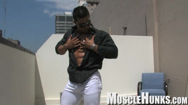 Scott Kirby is simply breathtaking - swarthy good looks, sensuous lips, and a rock-hard, lean and well-defined body. He heads out on the rooftop to take in a little sun. He oils up his impressive body, flexing and stripping down to a skimpy pair of shorts. And what a hot ass! Then he heads inside for a more intimate look at his naked body. Lying back on the sofa, Scott pumps the big muscle between his legs, and now you really get to see the power in those arms.