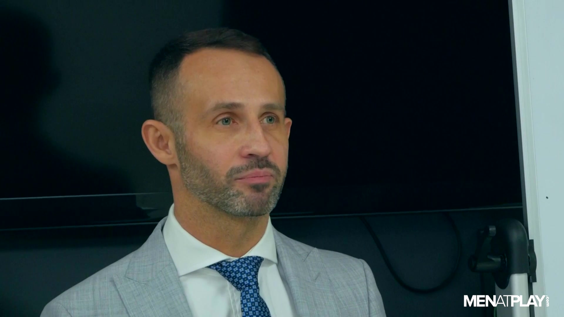 Approaching Vadim, Robbie grabs and plays with his massive cock through his pants until the professor finally succumbs to his advances and orders him to “unzip”.