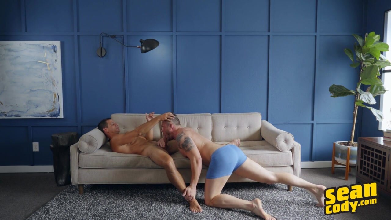 Muscular, tattooed hunk Sean is catching rays at the beach in his tight swim trunks when surfer Lachlan strides up with his board. The hunks eye each other up and wordlessly head back to the house, where Sean immediately starts sucking Lachlan's cock before he rides that dick. The horny bottom loves getting fucked deep in doggystyle, and the naughty top covers Sean's ass and balls in his cum, then licks it off before going straight to round two.